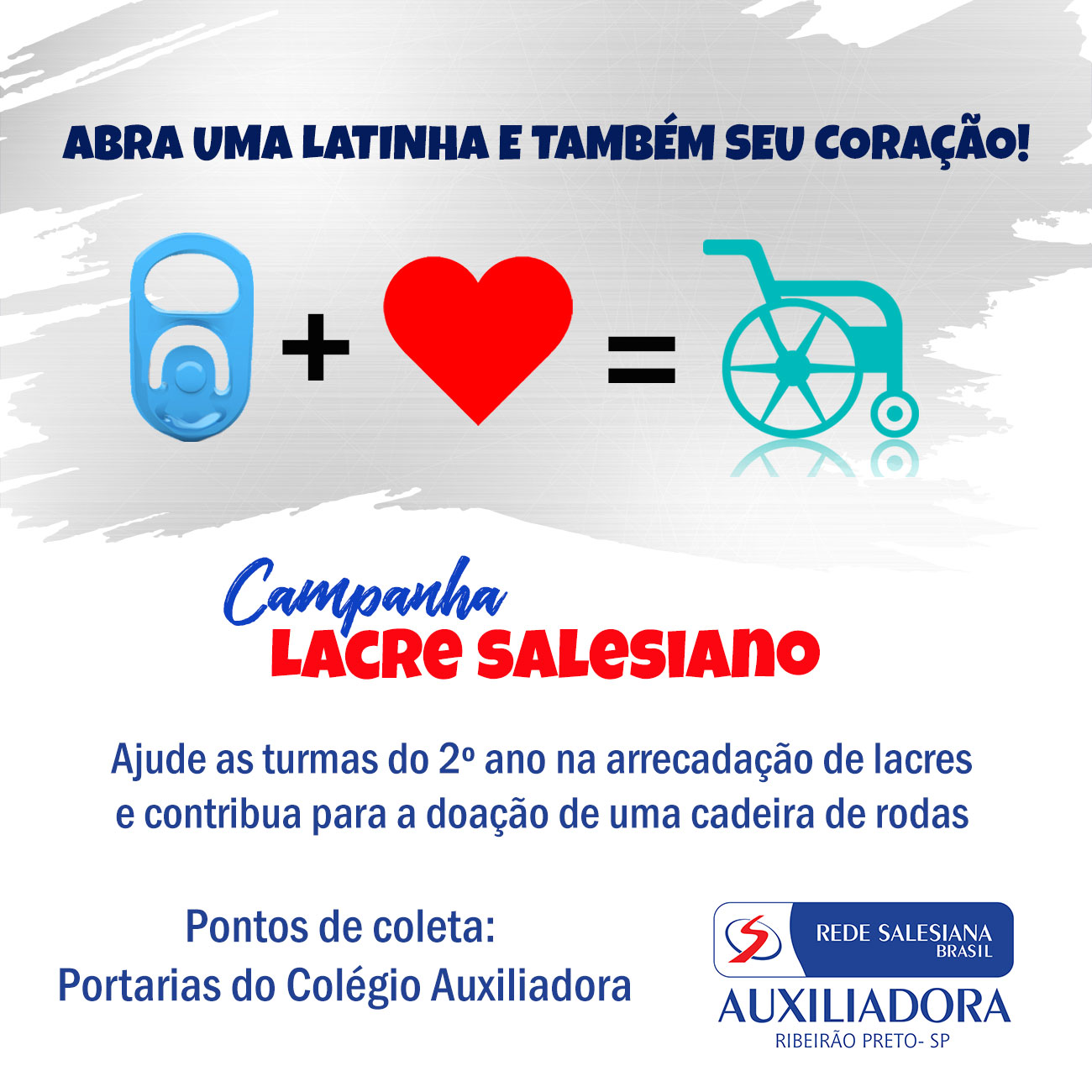Vocês sabiam que aquele lacre de alumínio das latinhas pode ajudar uma pessoa a se locomover? Nas aulas de Ciências Humanas e da Natureza, as turmas do 2º ano do Fundamental I estão estudando o efeito das ações humanas na natureza e a importância da reciclagem. Pensando nisso, eles resolveram promover uma campanha de arrecadação de lacres para trocar por uma cadeira de rodas. Assim, eles ajudam a natureza e as pessoas que precisam! A ação também faz parte do projeto desenvolvido pelas turmas para o Evento Cultural 2019, que acontecerá no dia 28 de setembro. Para isso eles contam com ajuda de todos nós! Deixe sua contribuição nas portarias do colégio.